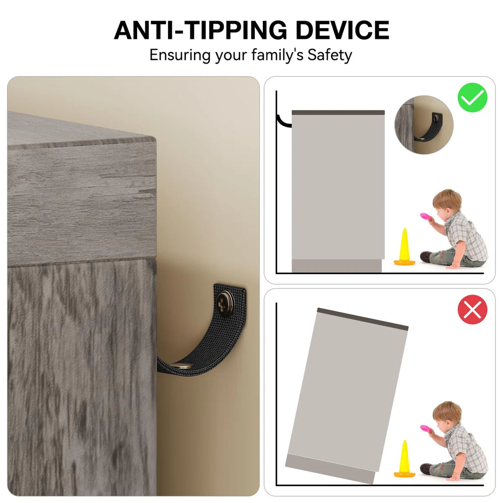Includes a two-door cabinet with a hanging rod for wrinkle-free clothing storage, plus four spacious drawers for folded items and accessories. The tabletop offers extra space for hats, décor, or cosmetics.