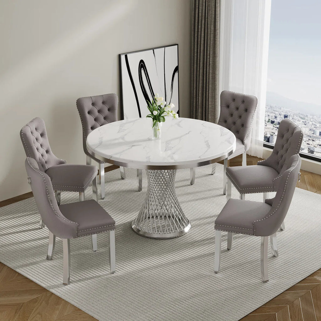 This elegant dining set features a 46.85-inch round marble tabletop supported by a sleek, stainless steel base with a refined finish. The marble surface not only enhances the visual presentation of your dishes but also exudes a high-end, luxurious appeal. The thick tabletop design minimizes wobbling and enhances stability, ensuring safe use — even in homes with children.