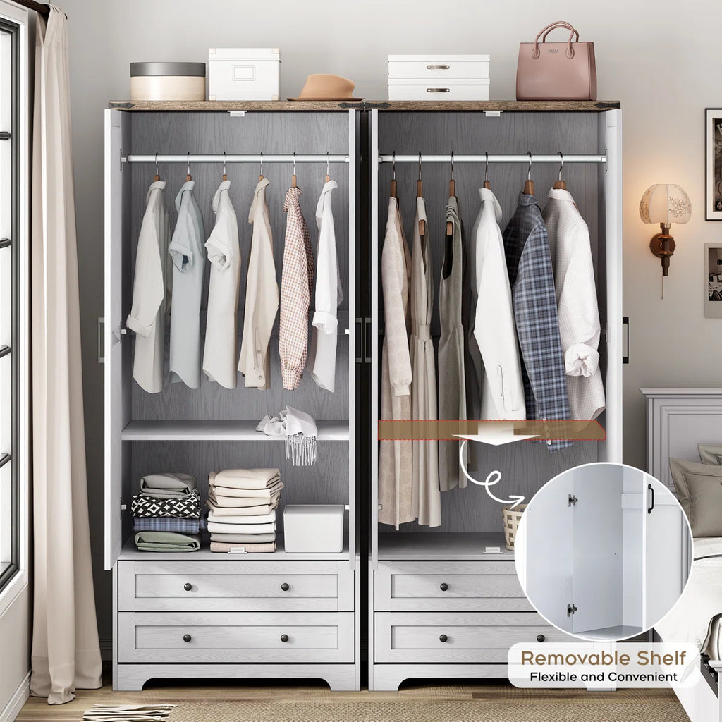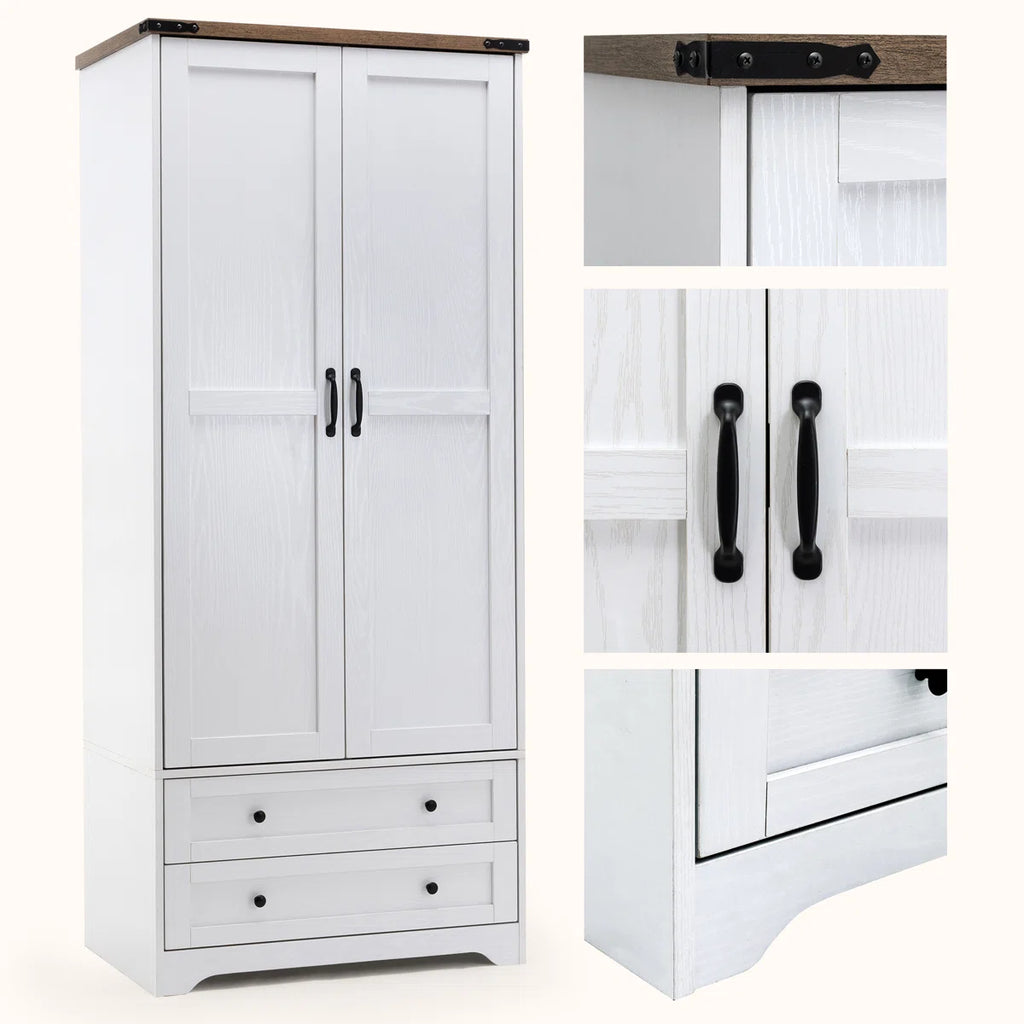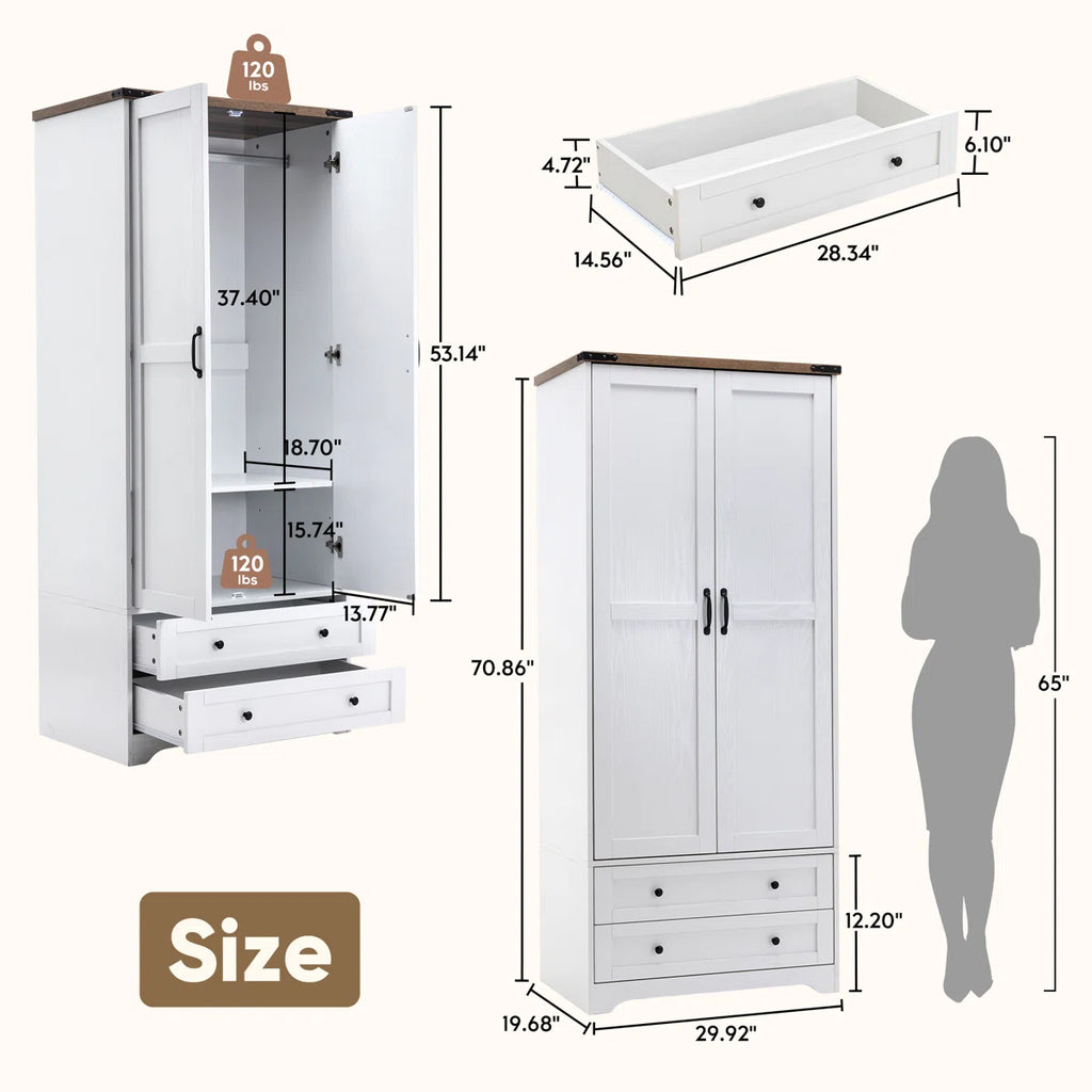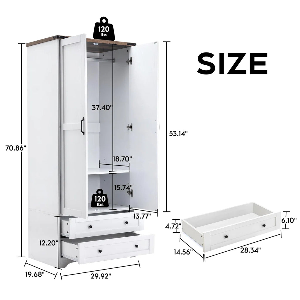 The doors of the storage unit are two large paneled doors. The unit opens to reveal a spacious centrally located garment rod, with two lower tiers and two drawers beneath the garment rod for folded clothes, towels, and linens. The storage unit also has a top area on the top for storage or display!