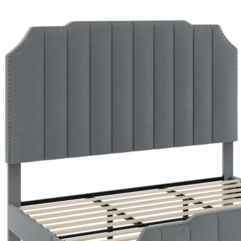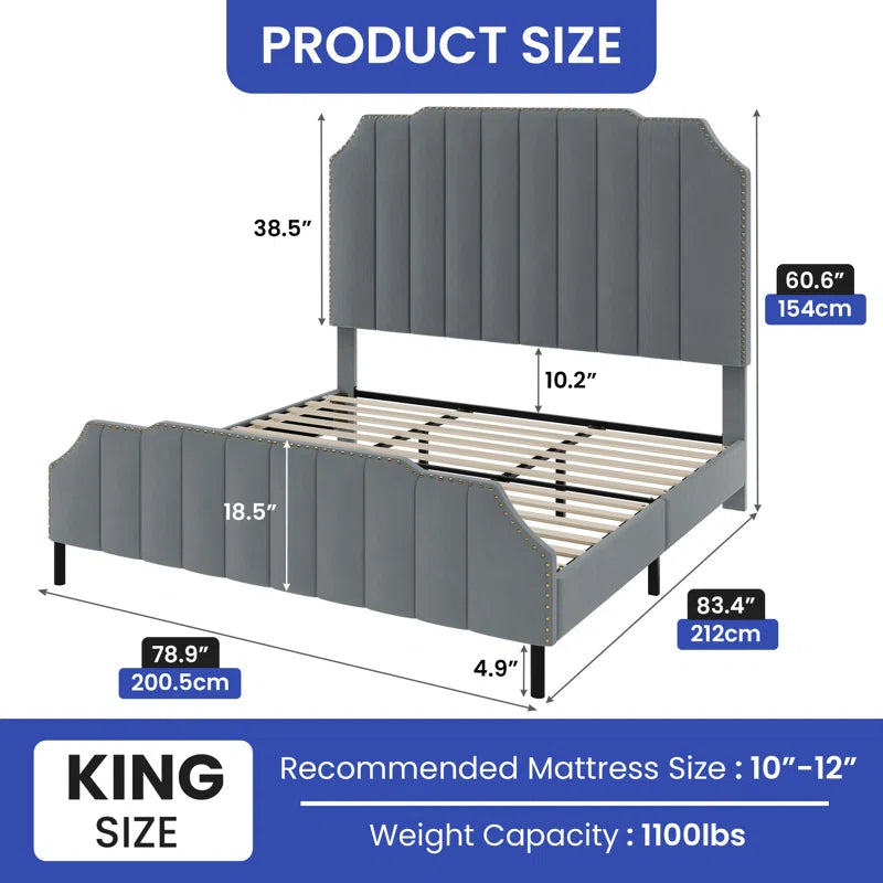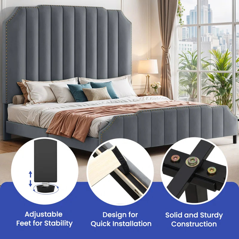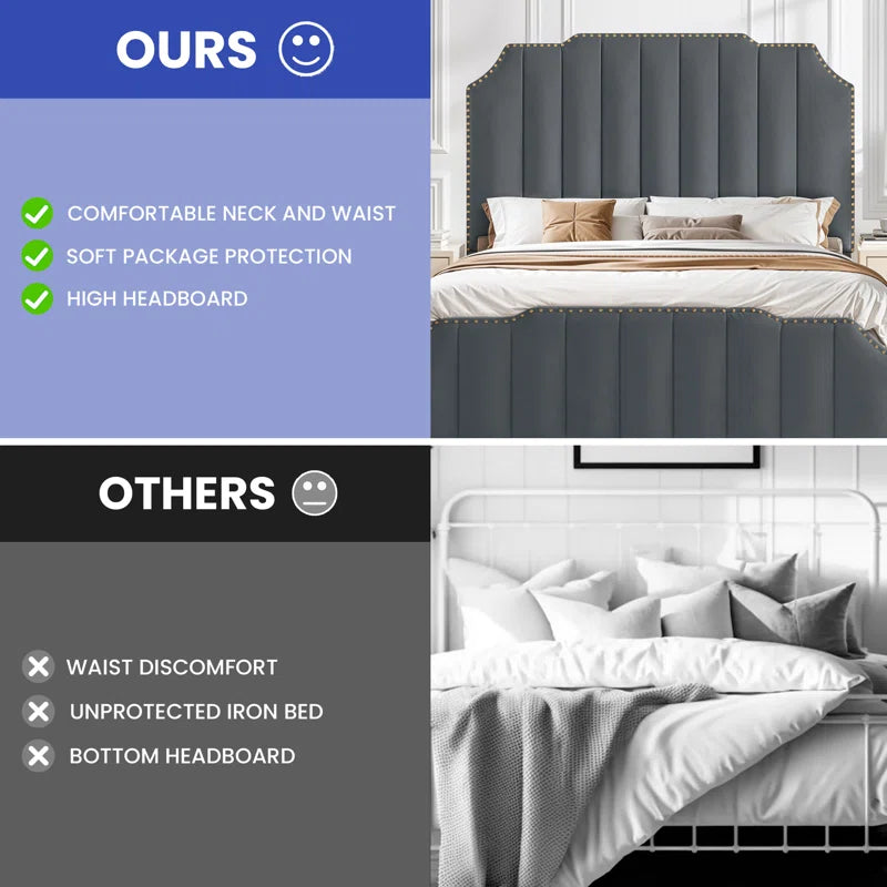 Elevate your space with our luxurious velvet upholstered bed — a perfect fusion of sophisticated design, comfort, and lasting quality. With its tall, scooped headboard accented by refined nailhead trim, this bed stands as a bold statement piece in any bedroom. In the world of restful elegance, it truly reigns supreme.