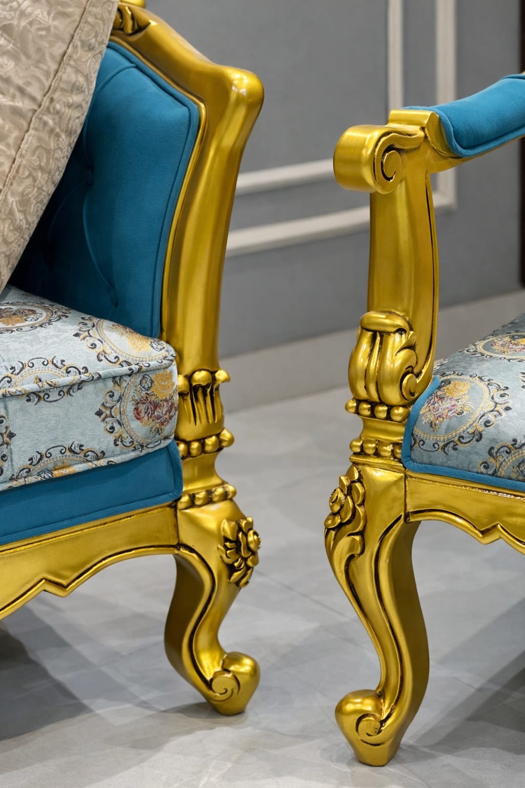 But it’s not just about comfort— the striking contrast between the intricately carved gold frames and the rich teal fabric creates a visual spectacle that exudes grandeur and opulence. Each piece is a work of art, showcasing exceptional craftsmanship rarely found in modern furniture.