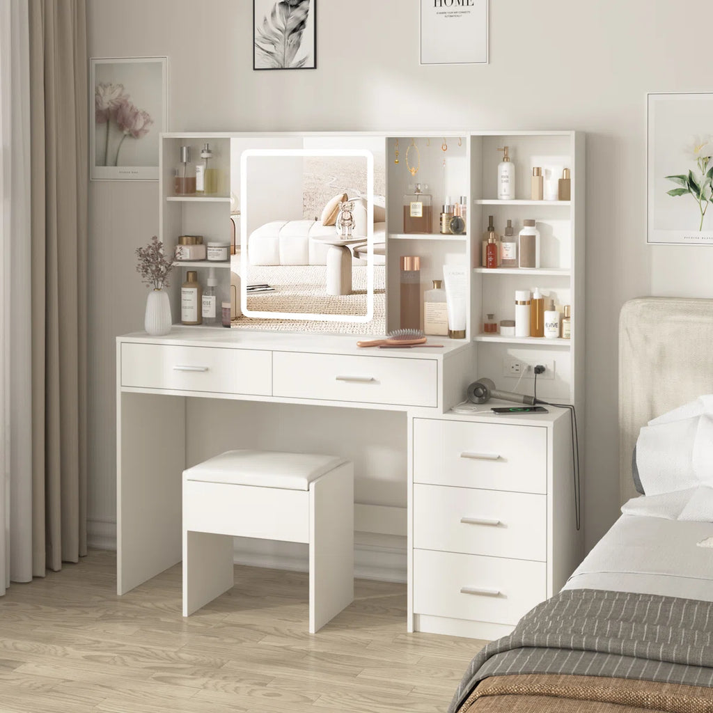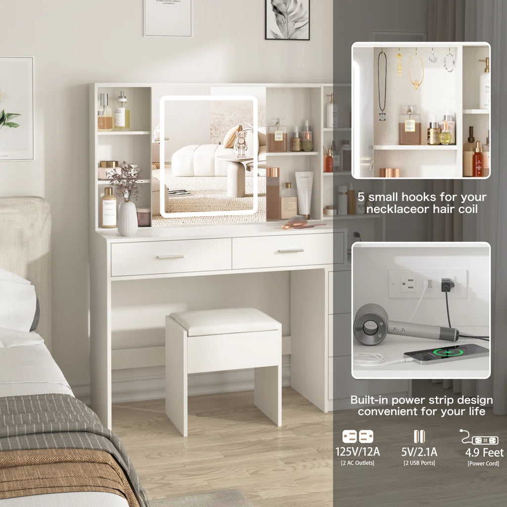 The vanity includes a built-in charging station with 2 standard outlets and 2 USB ports, allowing you to easily use a hair dryer, curling iron, or charge your phone, tablet, and other devices while getting ready. Its spacious desktop, multiple drawers, and clever storage design make it ideal for bedrooms, salons, or dressing rooms.