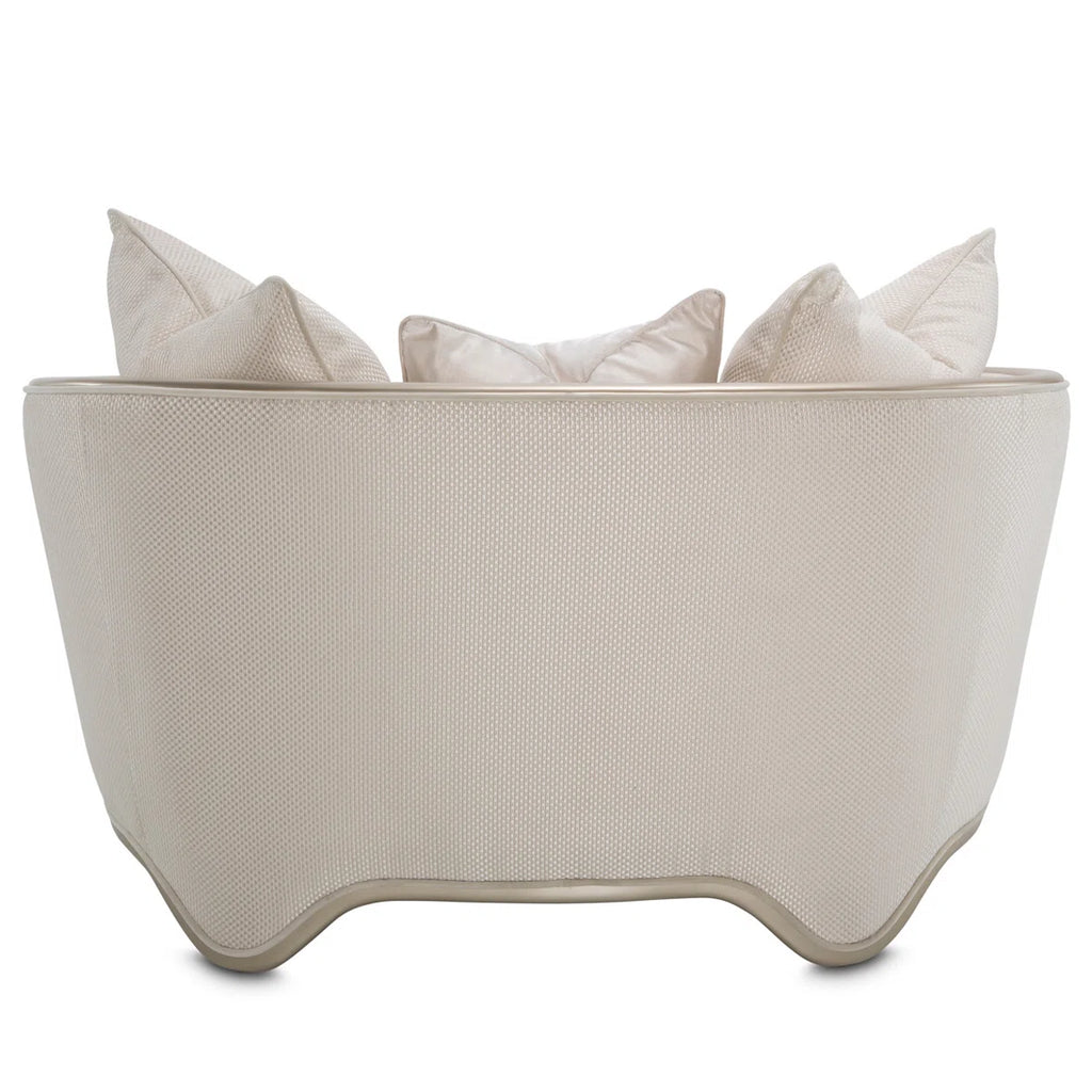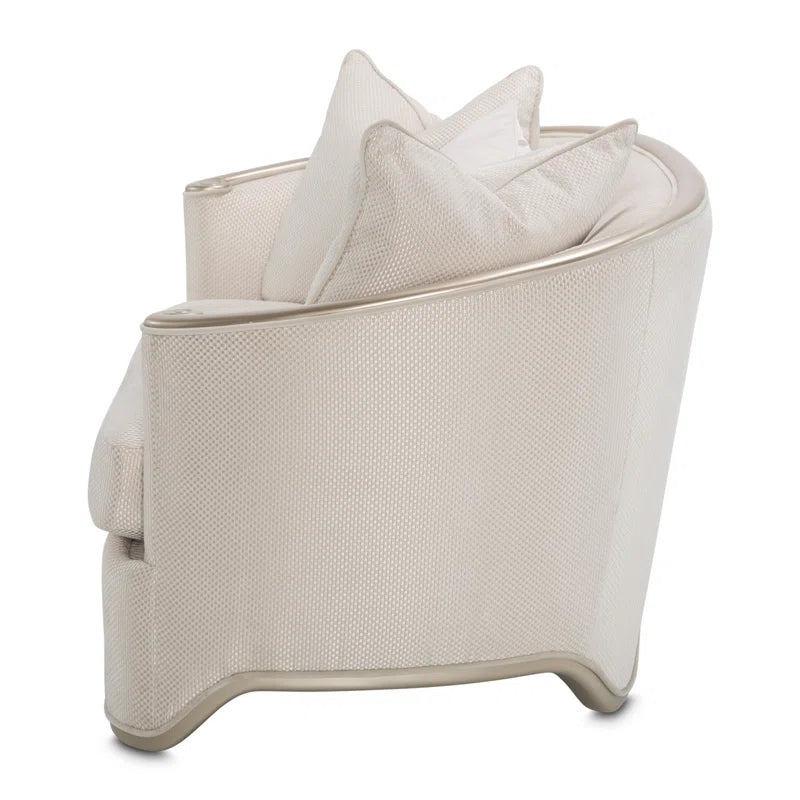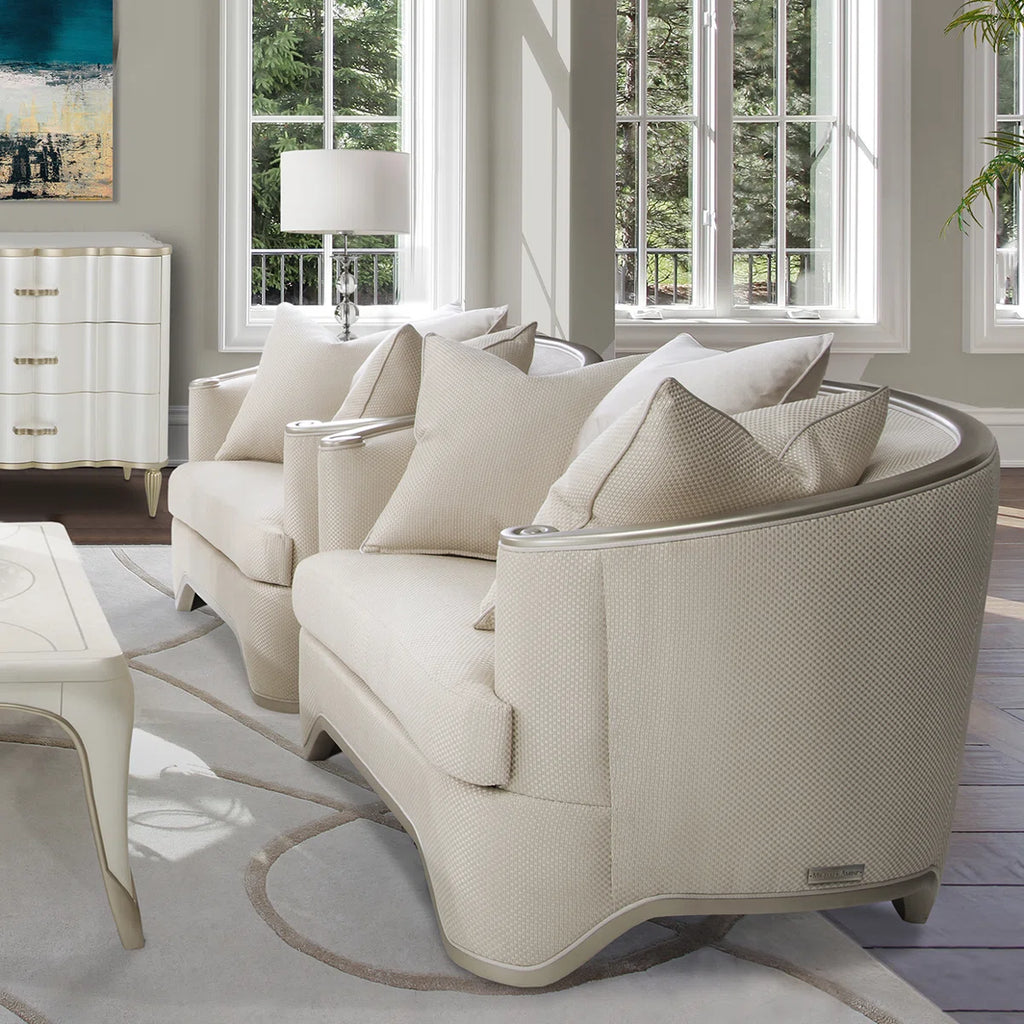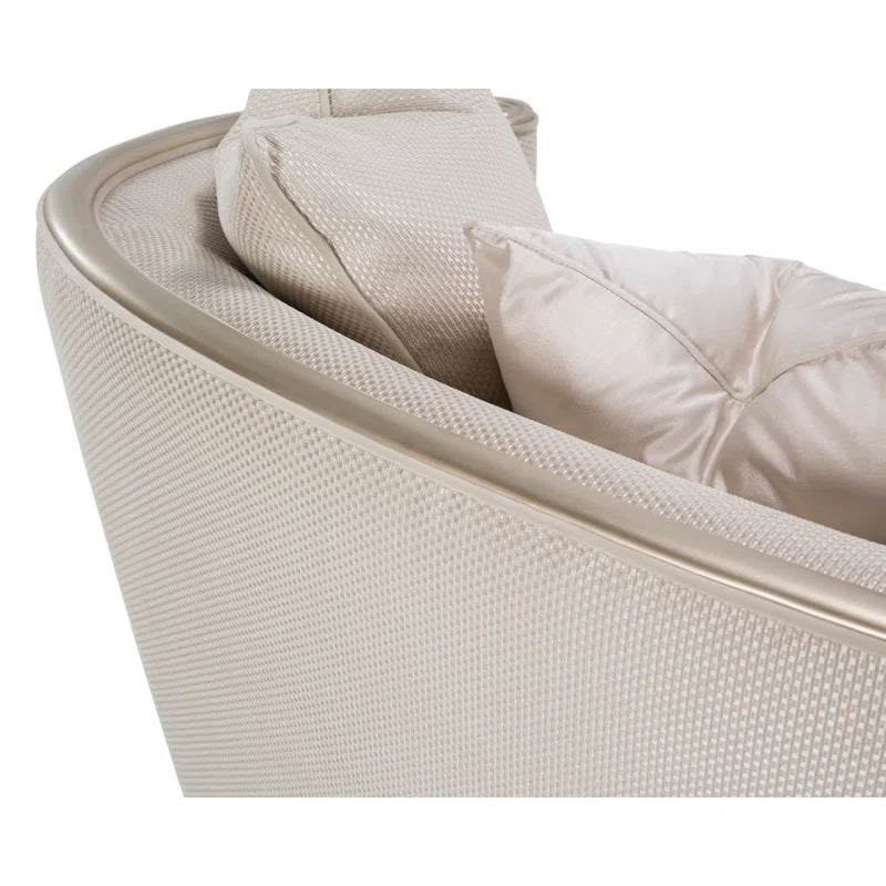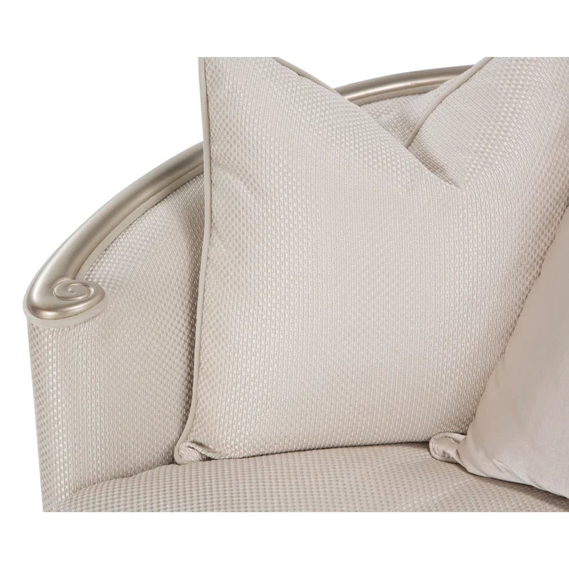 Upholstered in a rich champagne fabric inspired by the look and feel of raw woven silk, this piece delivers both visual glamour and exceptional comfort. The gently contoured back flows seamlessly into curved arms with elegant scroll details, creating a graceful and inviting form. A coordinated champagne-toned wood frame and legs complete the look with a cohesive, polished finish.