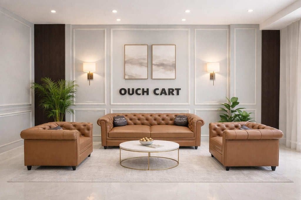 Elevate your living space with this luxurious Chesterfield Sofa Set by Ouch Cart, designed to deliver timeless elegance and exceptional comfort. Featuring a classic button-tufted design with rolled arms, this sofa set blends traditional craftsmanship with modern refinement—perfect for upscale homes, offices, or lounge areas.