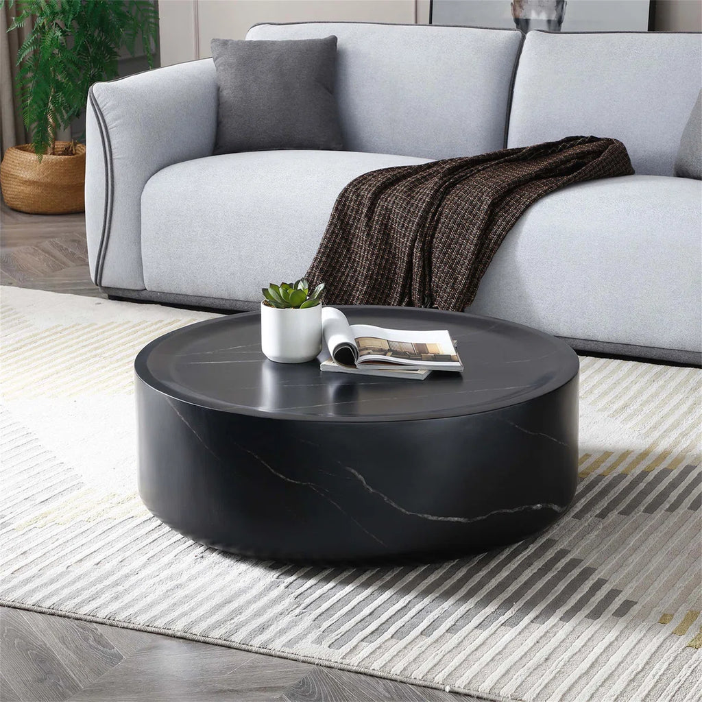 Modern Round Fiberglass Coffee Table with Faux Marble Finish | Luxury Drum-Shaped Center Table for Living Room