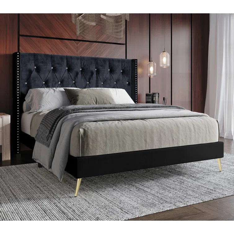 This low-profile bed features a stunning wingback headboard that effortlessly complements a range of interior styles, from glamorous to French country. Its solid and engineered wood frame is supported by sleek, splayed gold-finished feet, giving it a contemporary touch of elegance. Wrapped in rich velvet upholstery, the bed offers a tactile, luxurious feel, while foam-filled tufted diamond detailing and nailhead accents add visual appeal. Designed with comfort in mind, the headboard is perfect for leaning back and reading before bed. Additionally, the included center support legs ensure lasting durability and eliminate the need for a box spring.