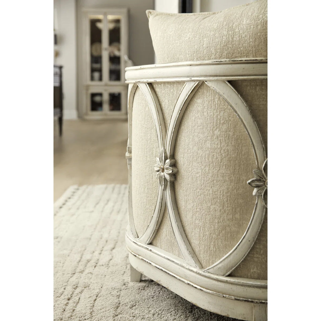The chair’s striking wood frame features repeating oval accents along the sides and back, highlighted by delicate flower medallions for a classic touch. Its dreamy Chalet finish blends Latte light wood with creamy Blanc tones, accented by subtle champagne and silver tipping. The glitter pearl performance fabric adds shimmer and softness, while the loose pillow back enhances comfort and style.