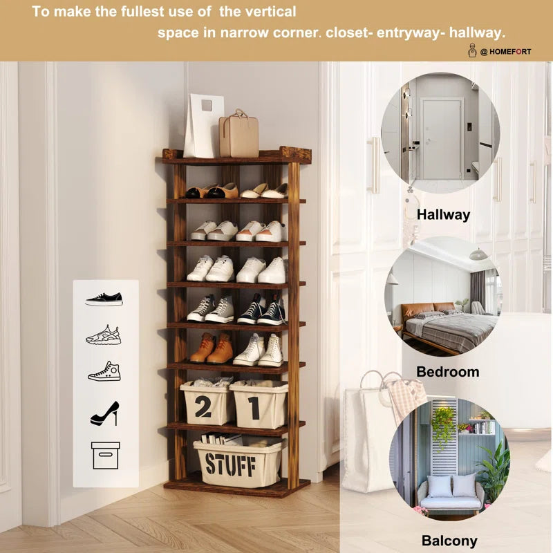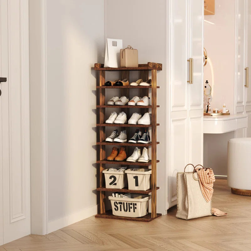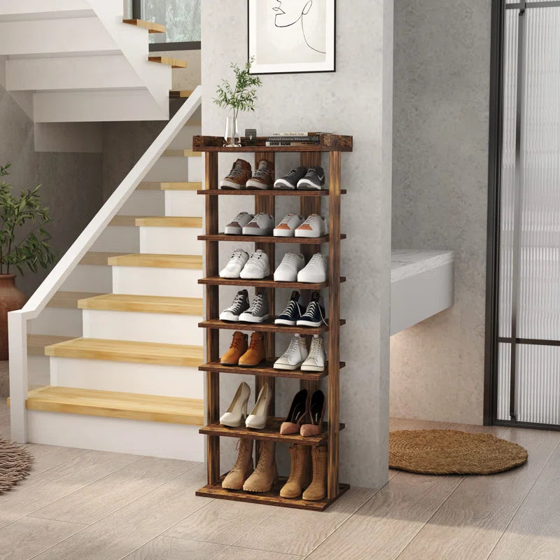 Maximize your storage potential with the Vertical 7-Tier Shoe Rack, a space-saving solution designed to keep your shoes organized without taking up valuable floor space. Its vertical design allows you to store multiple pairs of shoes, with each tier able to accommodate two pairs, making it ideal for families, shoe lovers, or anyone looking to keep their entryway or closet tidy.This versatile shoe rack is not just limited to footwear – its design makes it perfect for storing a variety of other items such as bags, accessories, or even toiletries. Whether placed in your living room, bathroom, bedroom, or entryway, this rack offers a practical and stylish way to organize your space.With its sleek and compact design, the 7-tier shoe rack is the perfect solution for any room that needs an organized, functional touch.