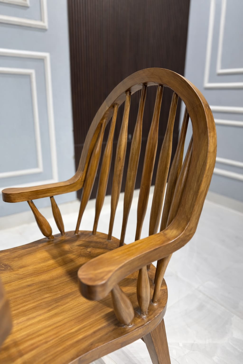 The set includes six matching Windsor-style chairs featuring curved spindle backs, contoured wooden seats, and sturdy angled legs for enhanced support and comfort. The classic design adds character while maintaining a clean and versatile look.
